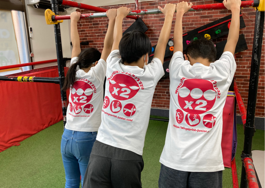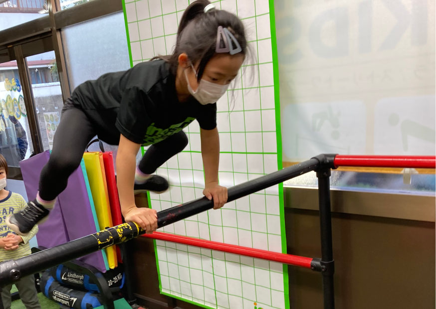 テツボークラブではパルクールやストリートワークアウトを取り込むことによって、子供たちがチャレンジしてみたいと思えるようなカッコいい技がたくさんあります。また、技とまではいかないまでもスイングしたり、ぶら下がって移動したり、着地を正確にしたり、バランスをとったりといった技に必要な要素の練習を盛りだくさん行うので、練習を続けるうちに技に必要な体の使い方を学び、それに伴って上半身の筋力も発達していきます。