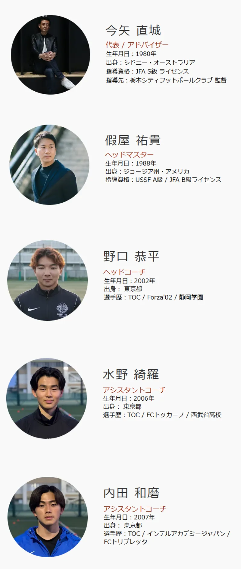 | その他/特記事項他 | <指導者紹介> * 代表 / アドバイザー:今矢 直城 生年月日:1980年 出身:シドニー・オーストラリア 【指導資格】 日本サッカー協会公認指導者S級ライセンス(JFA) 【監督歴】 2010〜2017 早稲田ユナイテッド 2021〜現在 栃木シティフットボールクラブ 監督 栃木シティフットボールクラブでは、2023年の地域CLで優勝を果たし、チームをJFL昇格に導いた。3季目にあたる2024年のJFLで優勝を果たし、チームをJ3昇格に導いた。 * 運営 / ヘッドマスター:假屋 祐貴 生年月日:1988年 出身:ジョージア州・アメリカ 【指導資格】 JAOS認定留学カウンセラー資格 USCG留学カウンセラー資格 アメリカ合衆国サッカー連合(USSF)A級ライセンス 米国ナショナルサッカーコーチング協会プレミアライセンス (NSCAA) 日本サッカー協会公認指導者B級ライセンス (JFA) パフォーマンス・強化/向上・スペシャリスト資格(NASM/PES) * ヘッドコーチ:野口 恭平 * アシスタントコーチ:水野 綺羅 * アシスタントコーチ:内田 和磨 |